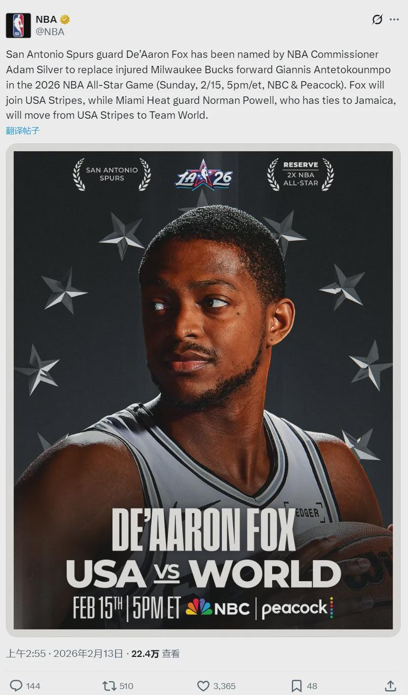 由于字母哥是代表世界队出战,而福克斯是美国球员。所以福克斯加入美国队,拥有牙买加国籍的诺曼-鲍威尔被换到世界队。截至目前,已有三个球星退出全明星正赛:库里、字母哥和亚历山大。东契奇现在还没确定是否出战……