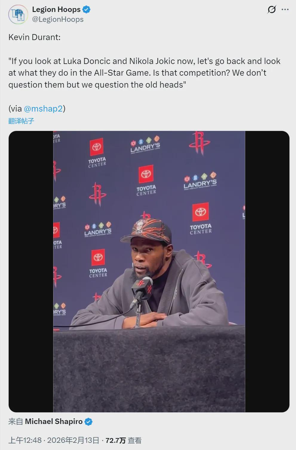对于球迷质疑全明星正赛没有对抗,沦为鸡肋。杜兰特接受采访时公开说道:“你们应该去问问欧洲球员,世界队的那些人想不想真打。看看东契奇和约基奇,他俩在全明星干了什么?往地上一躺,过了半场就扔,那叫竞争吗?”