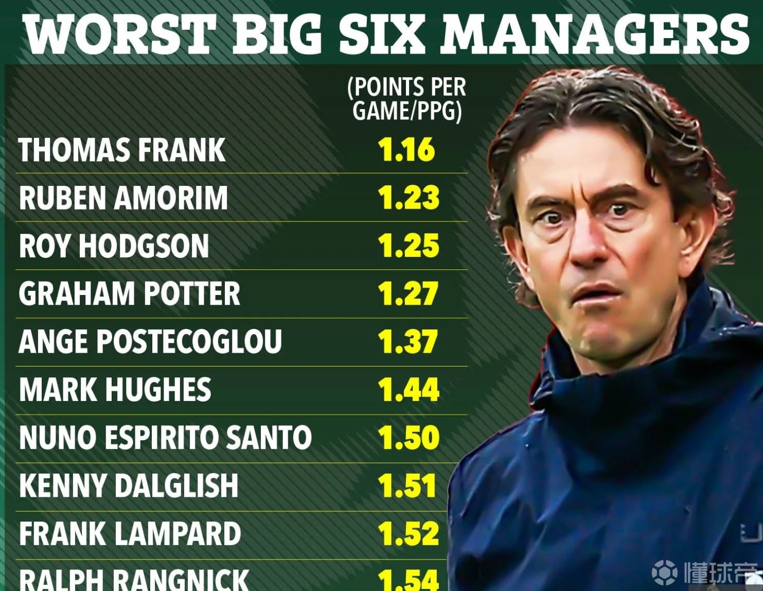 《太阳报》指出,托马斯-弗兰克是英超历史上BIG6豪门里战绩最差的正式主教练,场均仅1.16分,已经比阿莫林还少。