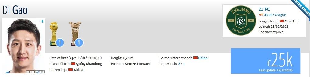 北京时间2月25日,德转更新,36岁前锋高迪第三次加盟浙江。在2025赛季球员效力于青岛西海岸。
