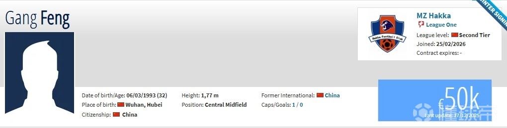 冯刚现年32岁,司职中场,此前球员效力于青岛西海岸,期间共出场60次,打进2球助攻8次。现在他在德转上的身价为5万欧元。