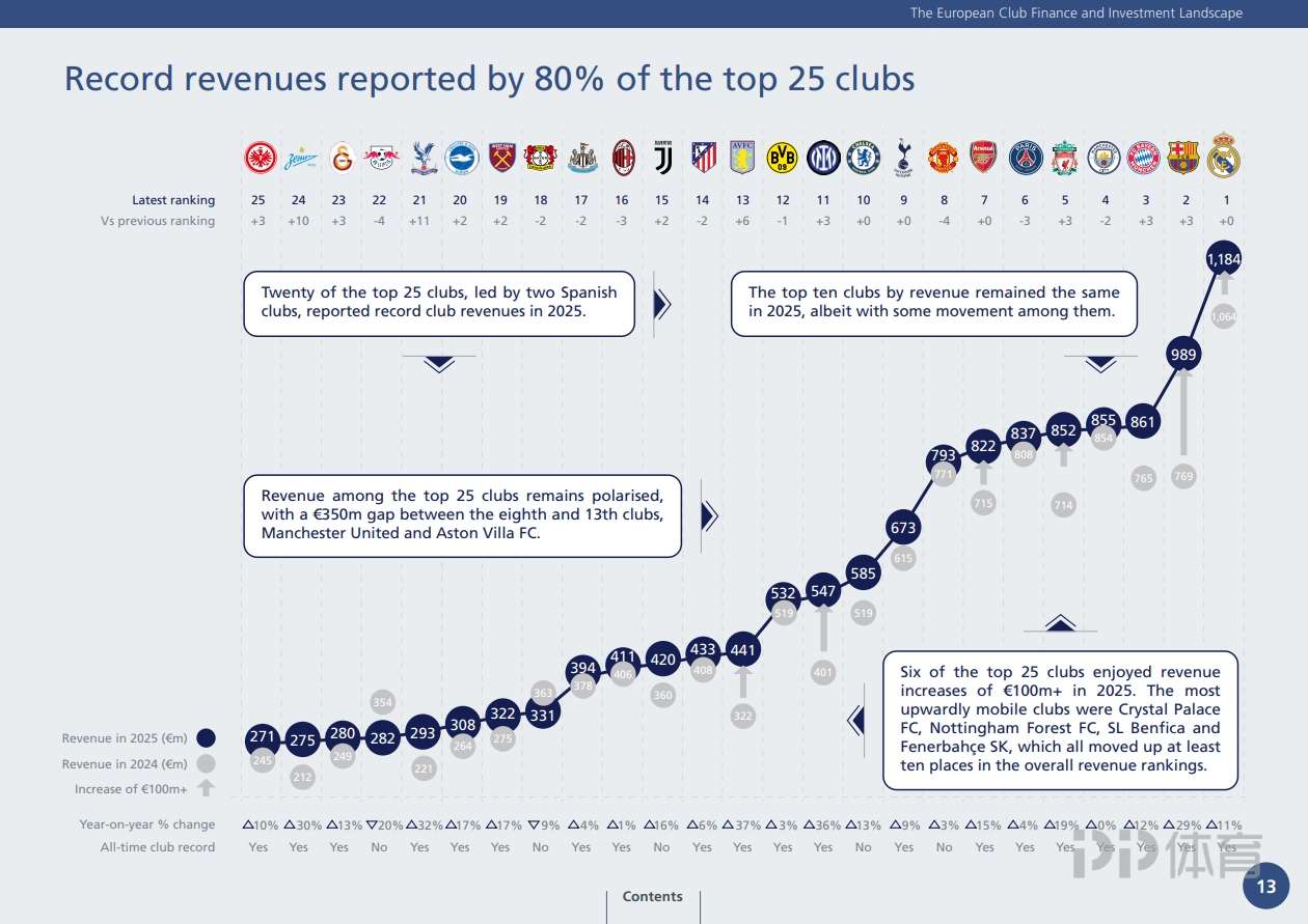 欧足联官方发布了《2025俱乐部财务与投资格局报告》,其中对所有欧足联球队在2025年的收入进行了排名,皇马以11.84亿欧元的收入排名第1,巴萨、拜仁分列二、三名。