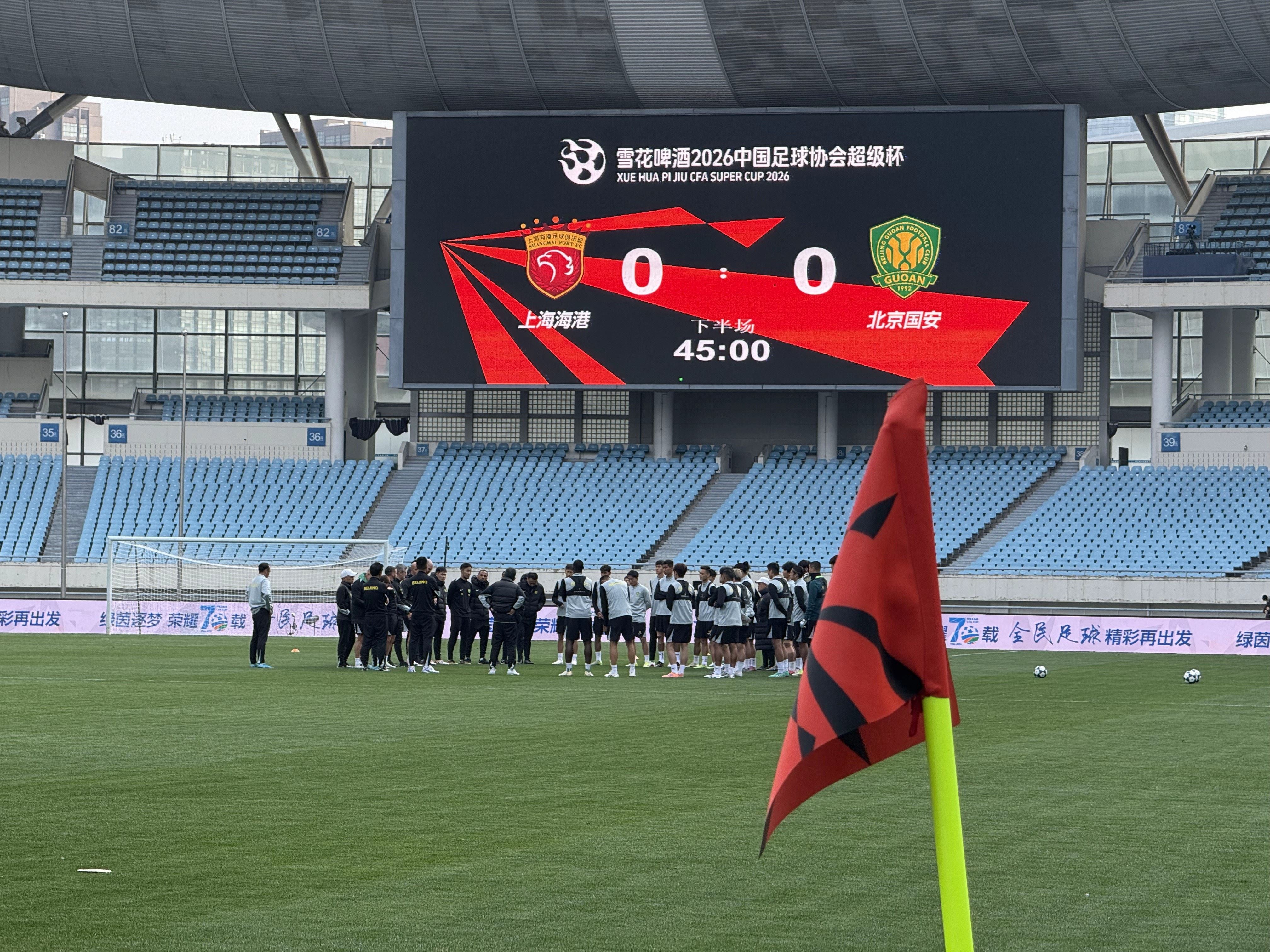 北京国安作为名义上的客队,晚于上海海港在15:00进行赛前发布会,训练则是被安排在了15:30进行,这一时间与明天超级杯正式开赛的时间一致。