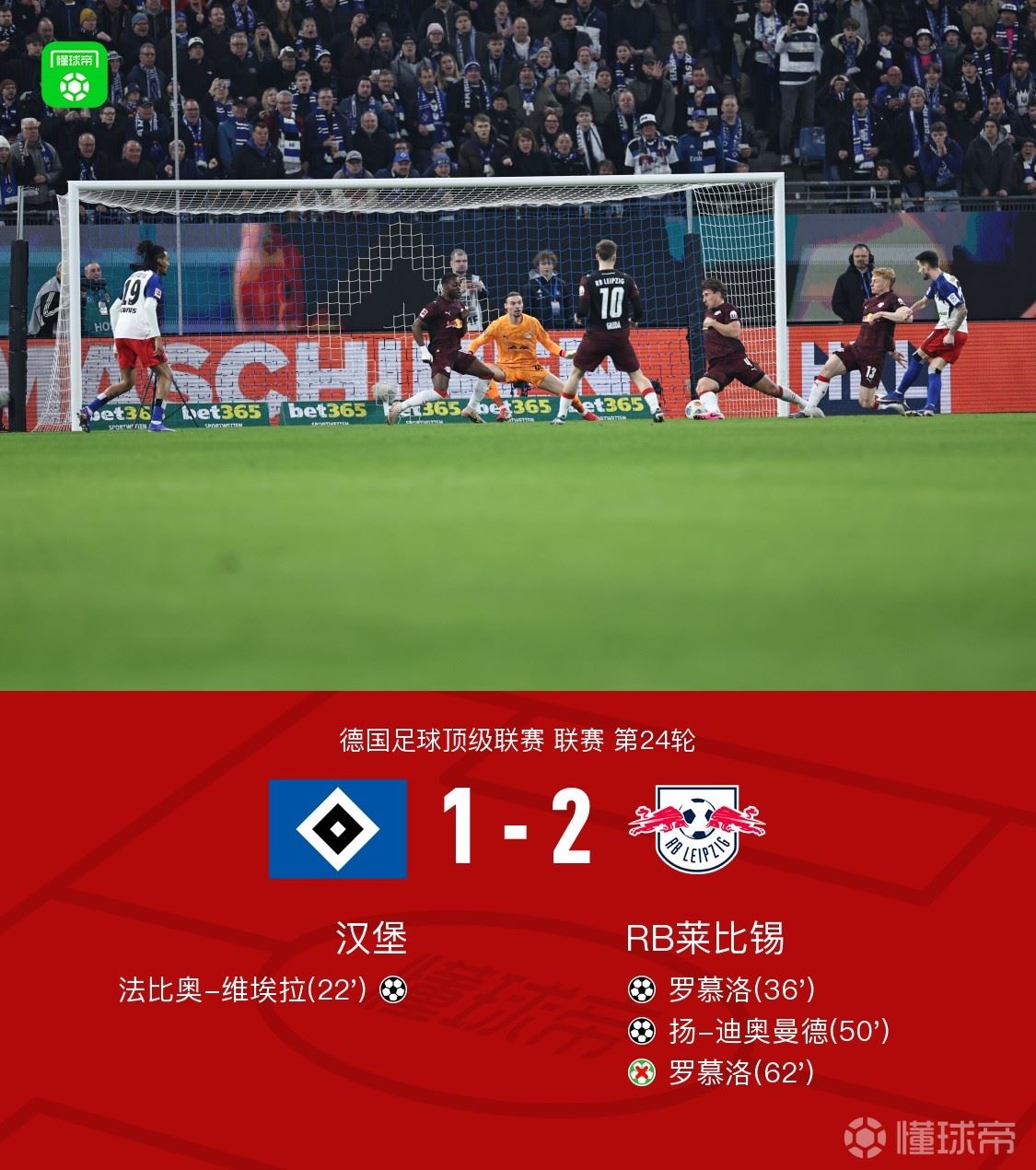 北京时间3月2日德国足球顶级联赛 联赛 第24轮,汉堡主场对阵RB莱比锡。上半场,法比奥-维埃拉破门。随后,罗慕洛脚后跟扳平比分。下半场,罗慕洛助攻,迪奥曼德建功。伦贝格手球送点,罗慕洛主罚被扑出。全场比赛结束,莱比锡2-1击败汉堡。